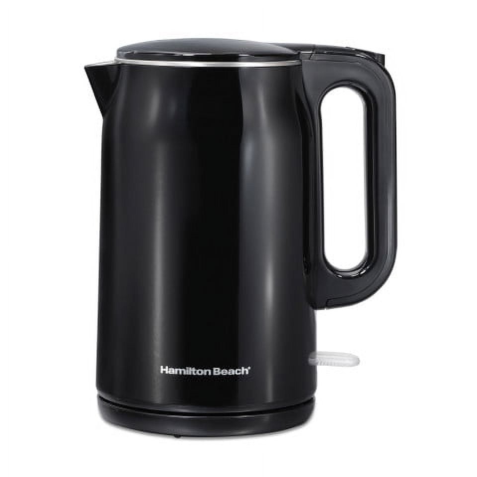 The Hamilton Beach Cool-Touch Kettle has a cool-wall exterior that's safe to touch. To boil water, simply fill the stainless steel, BPA-free interior with water and press down the power switch. The switch will light up to let you know that the power is on and boiling water is on its way. The Hamilton Beach Cool-Touch Kettle has a large 1.6 liter water capacity. Under the base, the cord wrap makes storage easy and keeps your countertop neat because it adjusts to your ideal length.
